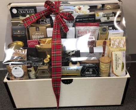 Cream colored linen trunk filled with all kinds of food goodies, including brownie brittle, crackers, veggie chips, kettle corn and so much more!