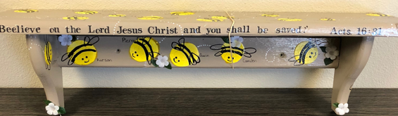 Turlock Christian Preschool Ladybugs class presents a handmade wooden table with Ladybug thumbprints and a plexiglass top.