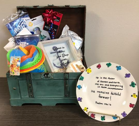 TCPS Lobster Class presents an ocean gift box and class plate. The gift box contains a $50 Red Lobster gift card, beach towel, ocean cookie cutters, Finding Nemo DVD, The Pout Pout Fish book, The Rainbow Fish Book, ocean decor and treats.