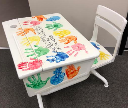 Desk with Chair Attached with Handprints - Jesus loves the little children of the world. Hand prints of each student in the class and their name. (Happy Hippos)